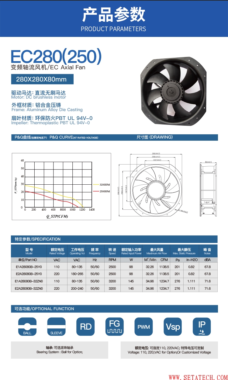 EC变频交流110V220V 28080(250)散热风扇 280*280*80MM铝框轴流风机