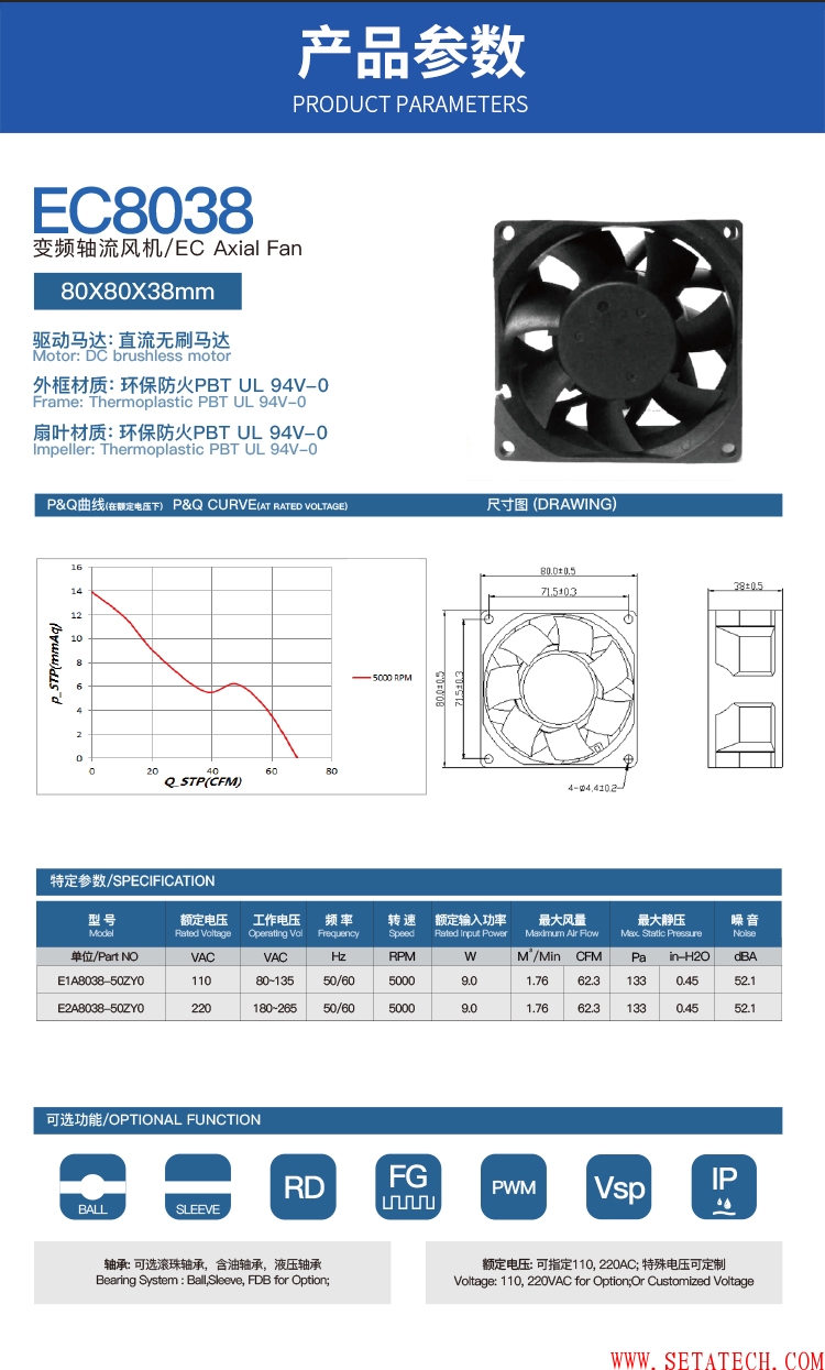 EC变频交流110V220V 8038散热风扇 80*80*38MM轴流风机